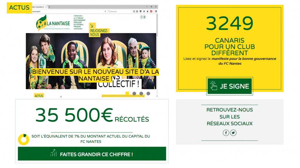 Florian Le Teuff : L’idée est née en 2011. L’association À la nantaise a créé une société par actions simplifiée (SAS) qui permet de récolter des fonds. Lors du prochain changement de propriétaire, cette SAS aura vocation à prendre part au tour de table pour épauler ce nouvel actionnaire en tant qu’actionnaire minoritaire. Le but étant de contribuer à tous les débats qui animent le FC Nantes, non pas en tant que décideur, mais nous souhaitons avoir le droit à la parole, pouvoir argumenter et exprimer notre attachement à nos valeurs et les défendre. Depuis que nous avons levé des fonds, la SAS détient l’équivalent de 7 % du montant actuel du capital du FC Nantes qui s’élève à 500 000 €. Par ailleurs, une étude indépendante de l’université de Nantes, réalisée auprès du public de la Beaujoire, a démontré que le potentiel économique d’un projet d’actionnariat populaire au FC Nantes, dans le cadre d’une ouverture du capital, s’élèverait à 1,7 millions, soit plus de trois fois le montant du capital actuel. L’actionnariat populaire est un modèle qui a démontré son efficacité dans les grands championnats européens et on souhaite, à Nantes, concrétiser le premier projet d’actionnariat populaire du football français.