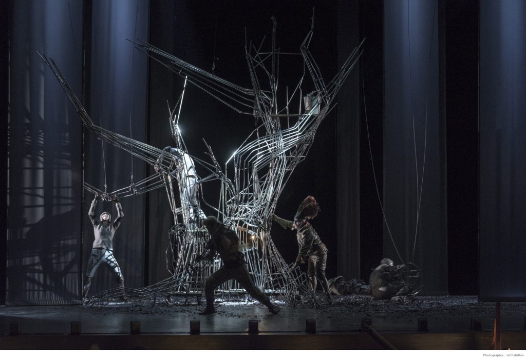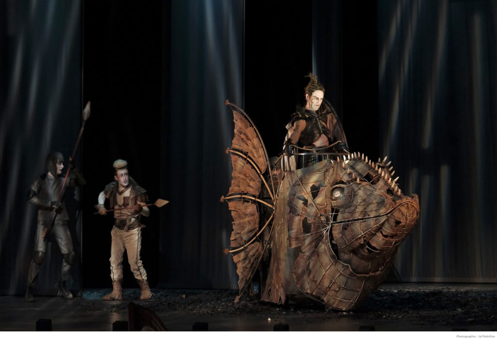 Bertrand Cuiller : Nous nous sommes rencontrés avant l’été 2017 pour travailler sur les coupures et l’intrigue. On nous demandait en effet de réduire « Rinaldo » à deux parties et deux heures de musique (au lieu des trois actes et trois heures de musique dans l’œuvre originale). Nous avons mis l’histoire de cette version en place. Claire a conçu ensuite son spectacle en écoutant une autre version de l’opéra, et nous nous sommes retrouvés en septembre avec les chanteurs pour les répétitions à Dunkerque, mais les décors n’étaient encore que des ébauches et les constructions imaginées par la scénographe restaient à expérimenter. Nous avons poursuivi en octobre à Royaumont, pour approfondir les détails musicaux, comme l’écriture des da capo*. C’est là que les solistes sont entrés physiquement dans l’univers et le mode de jeu de la mise en scène. Le continuo** est arrivé à Quimper pour accompagner les récitatifs***. C’est à Quimper également que le décor et les costumes ont été fabriqués.