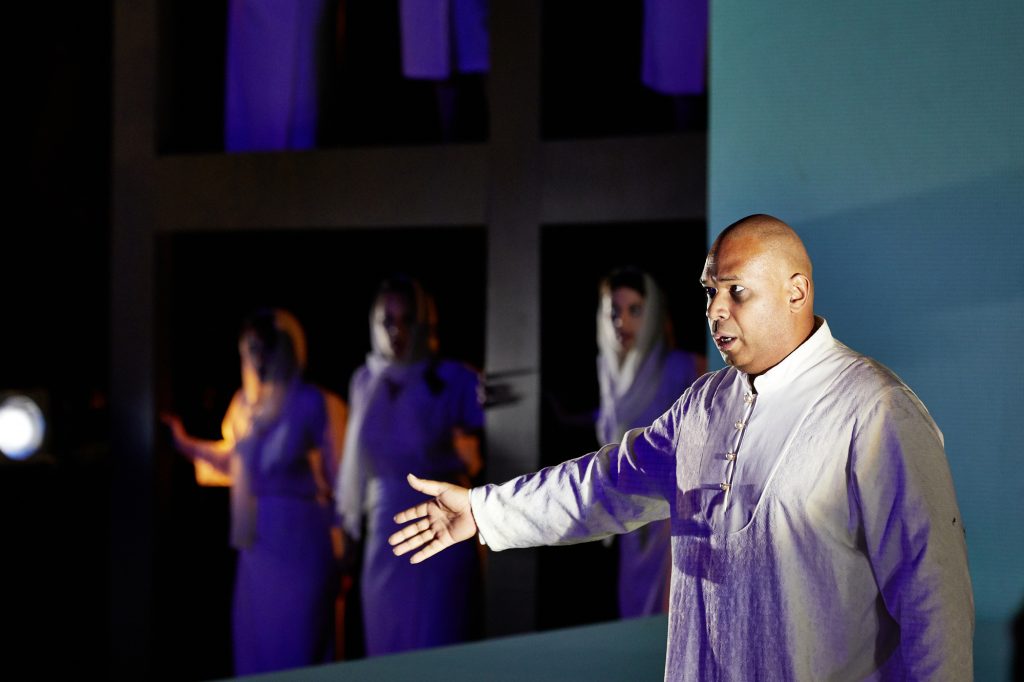 Leila entre en scène accompagnée par Nourabad, grand prêtre de Brahma aux allures de censeur, auquel Jean-Loup Pagésy apporte sa présence charismatique et ses graves pénétrants. Dans la vision d’Eric Perez, ce personnage austère est un dernier rempart contre la réalité. Nous entrons à l’intérieur d’un rêve que trois êtres partagent, enveloppés d’un même voile ; ils s’aiment et se débattent dans les affres de leurs désirs. Le voile s’étire de façon irréelle pour modifier les espaces, dans les lumières étranges et suggestives de Joël Fabing. Les couleurs changent selon les variations d’émotions, comme ce vert captivant au deuxième acte. La direction d’acteurs est très physique ; l’atmosphère est suffocante dans la moiteur de fantasmes enfouis qui refont surface. Les solistes, très investis, donnent corps aux éclats brûlants d’un songe…