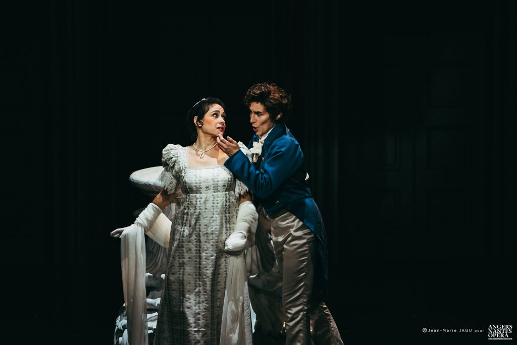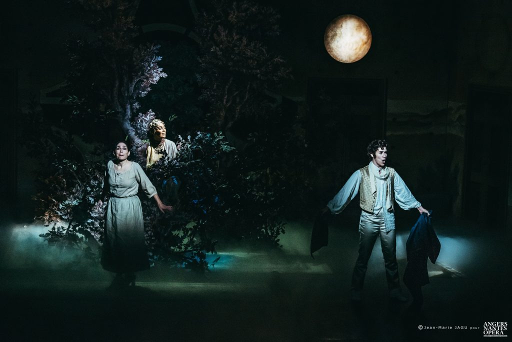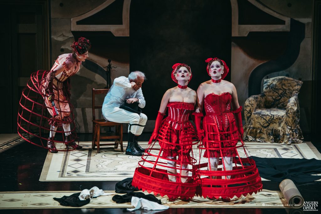 Madame de la Haltière compense en débordant d’autorité, et ses filles, soucieuses avant tout de paraître, tentent d’en être maladroitement la copie. C’est l’immense Rosalind Plowright qui joue cette figure dominatrice, et c’est un grand bonheur de la voir et de l’entendre sur la scène du Théâtre Graslin. Sa voix est d’une puissance étonnante et elle apporte au personnage une présence marquante. Cette fabuleuse cantatrice a notamment été une très grande Leonora du « Trouvère » de Verdi, où elle s’est montrée bouleversante dans une mise en scène de Piero Faggioni, où se mêlaient le feu et la glace, au Covent Garden de Londres en 1989, aux côtés de Placido Domingo avec qui elle a enregistré une version mythique de l’ouvrage, sous la direction de Carlo Maria Giulini. Parmi les autres plaisirs du spectacle, on retrouve dans l’une des sœurs Marie-Bénédicte Souquet, qui était justement fascinante en Titania du « Songe d’une nuit d’été » de Britten en avril dernier à Tours.