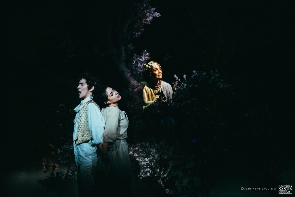 A l’instar du conte, c’est la magie qui vient sauver la situation. Dans cet ouvrage, elle a les contours d’un rêve, et la fée évoque Titania du « Songe d’une nuit d’été ». A la fin, on la retrouve dans la fosse d’orchestre, et la troupe s’adresse au public, comme dans la pièce de Shakespeare. Chez Massenet, la scène du chêne des fées rappelle l’étrangeté de la forêt du songe ; des esprits s’y retrouvent également pour abriter des couples en fuite. Tous ces enchantements sont avant tout liés à la puissance du théâtre, dont la mise en scène exploite toutes les ressources. Marianne Lambert donne à cette marraine consolatrice des aigus scintillants dans un chant particulièrement envoûtant, d’une beauté à couper le souffle. Elle orchestre les événements jusqu’à la fin heureuse comme un démiurge, avec une énergie communicative.