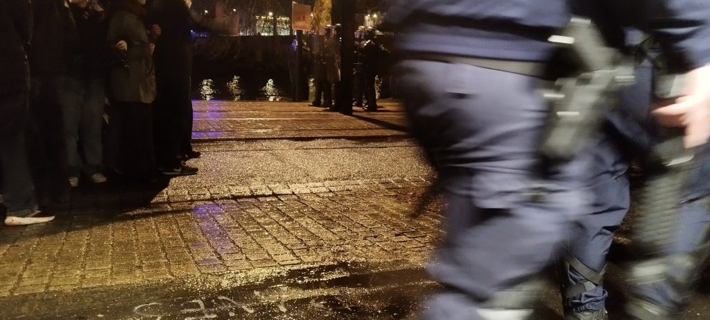 A 20H49 un ordre de dispersion est lancé par un policier côté Erdre. Pensant pouvoir sortir de la nasse, la foule se dirige vers la rue Chateaubriand. Elle se heurte au cordon qui refuse de la laisser passer. « Interdiction de sortir, la prise part à la manifestation oblige de rester jusqu’à la fin, sauf en cas de danger« , déclare un CRS.18/02/2026 Photo : Nathan Brunaud