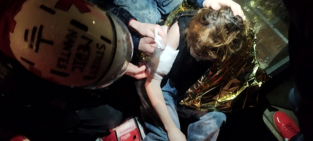 Dans la liesse lié à la libération, un fumigène est allumé dans la queue du cortège. Il provoquera une dernière charge de CRS qui dispersera la foule et blessera une militante au bras. « C’est la troisième fois qu’on m’attaque durant le rassemblement« , déclare t-elle en pleure sous la douleur. Elle sera pris en charge par un street-médic qui après un diagnostic lui pose une poche froide sur son bras gonflé. Le militant soigneur nous confie: « Aujourd’hui j’ai soigné 5 blessé.es par des coups de matraque. » 18/02/2026 Photo : Nathan Brunaud