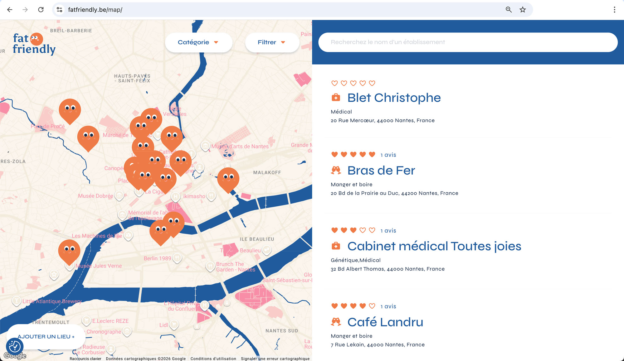L’association belge Fat friendly a créé une cartographie collaborative francophone de l’accessibilité des espaces aux personnes grosses. Le site répertorie boutiques, lieux culturels, bars et restaurants, mais aussi professionnels de la santé bienveillants envers les personnes grosses. https://fatfriendly.be