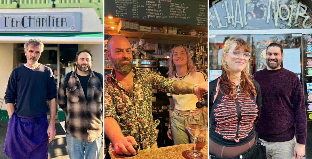 De gauche à droite : Loïc et Benjamin, co-gérants de L’Enchantier ; Manu et Clé, co-gérants du BB’O ; Becky et Yann, serveurs du Chat Noir Bistrot des Arts, novembre 2025 © Fragil