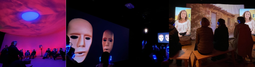 Viennent ensuite les jeux de lumière, inspirés du travail de l’artiste James Turrell. La directrice d’Ars Anima développe, « la lumière, c’est de l’émotion. C’était une manière d’inviter les gens à plonger dans cet univers, dans la vie du personnage, de les accompagner tout doucement ». Ainsi, chaque espace marque une étape dans la traversée. « Acte un, on est dans la compréhension de la lignée, d’où on vient, dans le ventre de la mère ». Puis viennent l’obscurité, les masques, la sensation d’impuissance. À cette étape, on plonge dans les peurs et les combats de ces femmes. Les masques incarnent les figures qui les ont blessées, celles à l’origine de leurs angoisses. La lumière se resserre, les sons deviennent plus tendus. Le·la visiteur·ice ressent brièvement ce face-à-face avec ce qui a mis la protagoniste en danger. Enfin, la lumière revient. Une personne évoque les combats, mais surtout les réussites de la protagoniste, ainsi que les associations nées de ces luttes. « On réintroduit la vie avec un personnage qui s’adresse de très près au public pour maintenir cette intimité », explique la conceptrice.