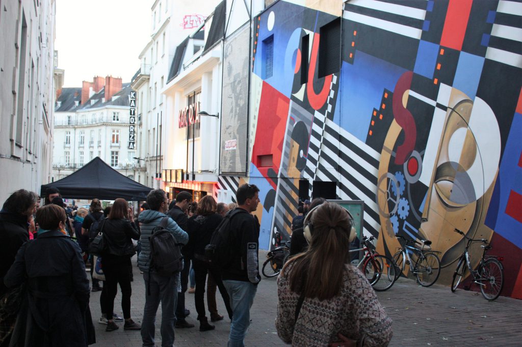 Au détour de la place Graslin et de son théâtre, un attroupement se forme ce mardi soir. Un petit chapiteau noir a été installé près de l’entrée du Katorza, mais tous les yeux sont rivés sur cet immense mur de la rue Corneille, devenu incontournable pour les nantais au fil des ans. Une toute nouvelle fresque a remplacé les graffitis et autres compositions anarchiques qui s’y trouvaient depuis une vingtaine d’années.