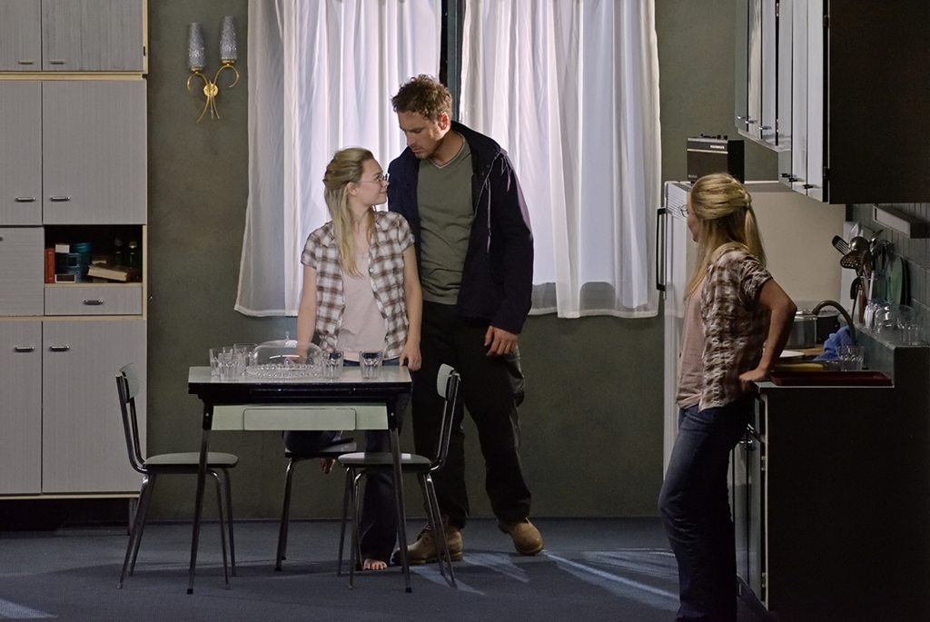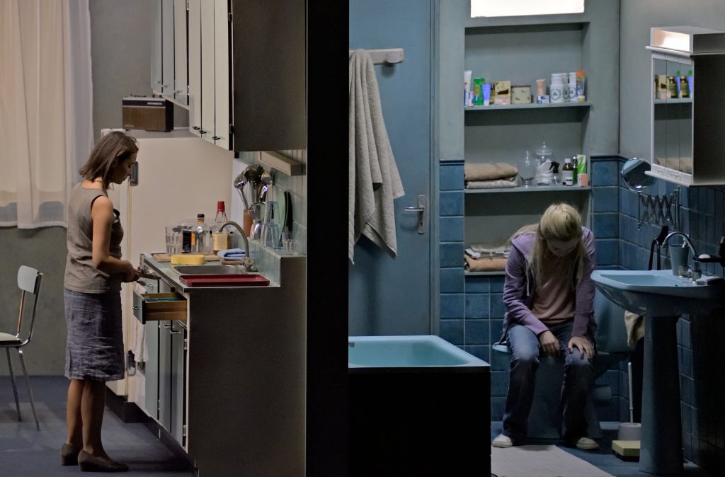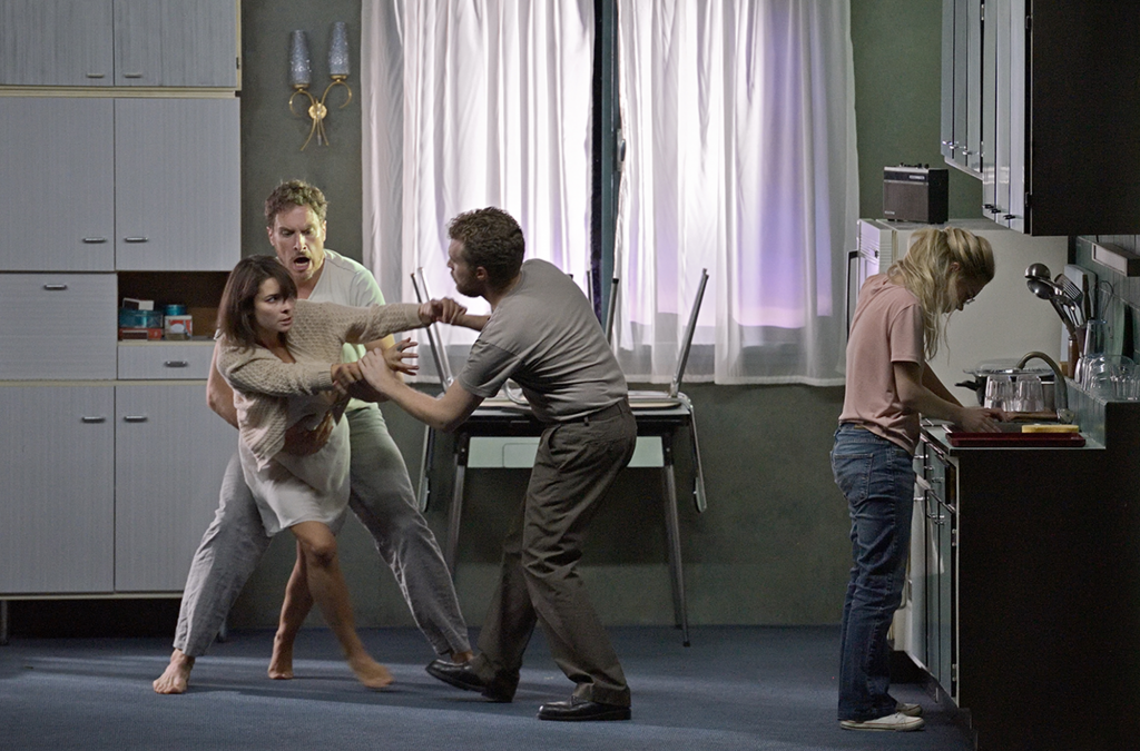 Les voisins du dessus apportent un perturbant décalage avec ce qui se joue en dessous. Au moment où la femme découvre la relation de son mari avec l’intruse, on joue à l’étage avec les enfants, et la voisine pleure de façon dérisoire parce qu’on ne veut pas jouer avec elle. Ces voisins représentent aussi une normalité écrasante, et leur départ en famille à la messe est extrêmement violent pour celle qui ne maîtrise plus rien. Sofia, hébétée, demande ensuite à sa rivale si elle croit en Dieu. La femme subit les mots blessants des autres ; elle se réfugie dans son monde intérieur. Chloé Briot apporte à cette femme blessée une  présence d’une bouleversante simplicité ; le cheminement vers la folie n’en est que plus déstabilisant.