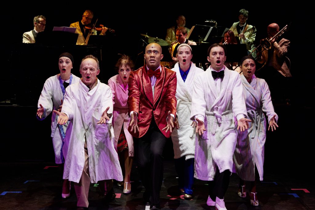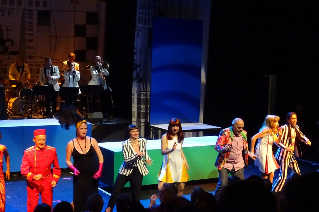 La mise en scène est pleine d’invention joyeuse, et l’énergie de tous est débordante. Les écrans montrent aussi des réclames de l’époque, ou de petits films, en interludes, lors des coupures de programmes. L’une des grandes métamorphoses entre les deux parties du spectacle est le passage à la couleur, pour que la fête soit encore plus belle.