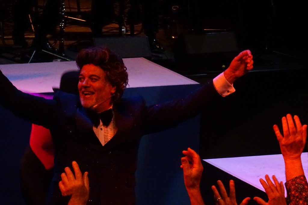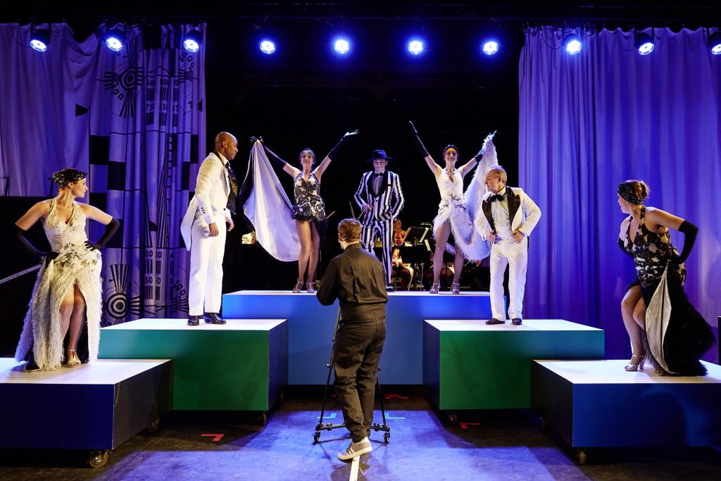 Dans le spectacle d’Olivier Desbordes et de Benjamin Moreau, on aspire à être star d’un jour, et il y a de l’émerveillement à participer à ce show télévisé. Les airs connus d’Offenbach ont l’aspect de numéros ou de tubes, Christophe Lacassagne chante « Je veux m’en fourrer jusque-là » du Baron, relooké en crooner, avec des accents qui rappellent Dick Rivers ou Eddy Mitchell, Thierry Jennaud joue un brésilien qui « a de l’or » avec la gestuelle tourbillonnante de Claude François, dans un costume doré et entouré de danseuses, tandis que Diana Higbee donne à l’air de Métella « C’est ici l’endroit redouté des mères » toute l’intensité des chansons populaires des années 30, illustrées notamment par Fréhel (1891-1951). Clément Chébli (qui joue aussi Joseph, dont Gardefeu a pris l’identité !) filme ces chanteurs, dans de très beaux gros plans qui traquent leurs émotions. Les images du vidéaste sont retransmises en direct sur des écrans, comme dans la mémorable « Traviata » de 2016 à Saint-Céré.
