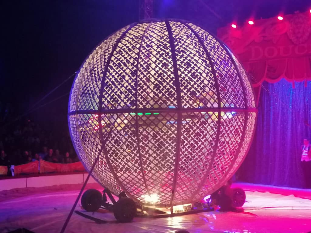 Ces intermèdes laissent ensuite place à des numéros autrement plus périlleux. Un numéro gracieux de tissu aérien en couple, original car la femme porte également l’homme, et pas seulement l’inverse. Un adolescent qui tient en équilibre sur cinq plates-formes progressivement superposées, elles-mêmes en équilibre sur un cylindre en mouvement. Un jongleur de diabolos enflammés, qu’il embrase de sa bouche remplie d’essence. Et pour finir, le « Globe de la mort », sphère métallique de cinq mètres de diamètre dans laquelle trois motos s’entrecroisent à toute vitesse, avec autour des centaines de paires de paupières éberluées.