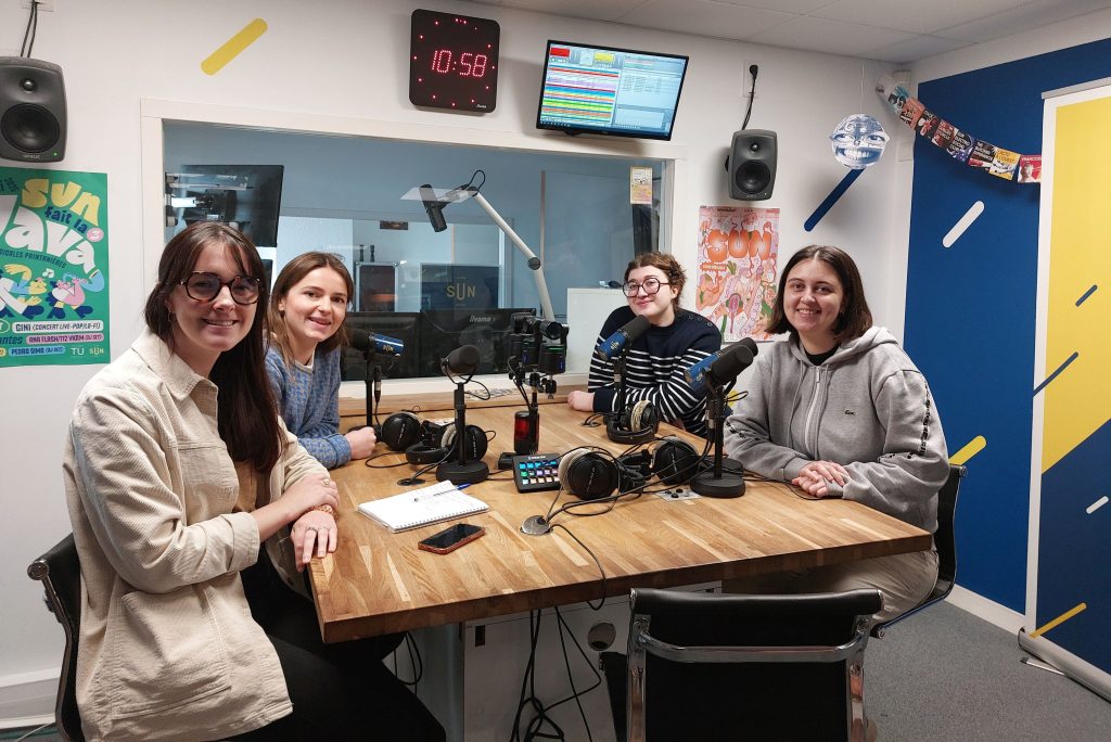 De gauche à droite, Elouan Prat, Manon Vieillet, Claire-Marie Lemasson, stagiaire et services civiques font des tests de son dans les locaux d’euradio avant l’entrevue avec Hélène Lévêque, la directrice adjointe. Crédits Valérie Babin – 30/10/2025