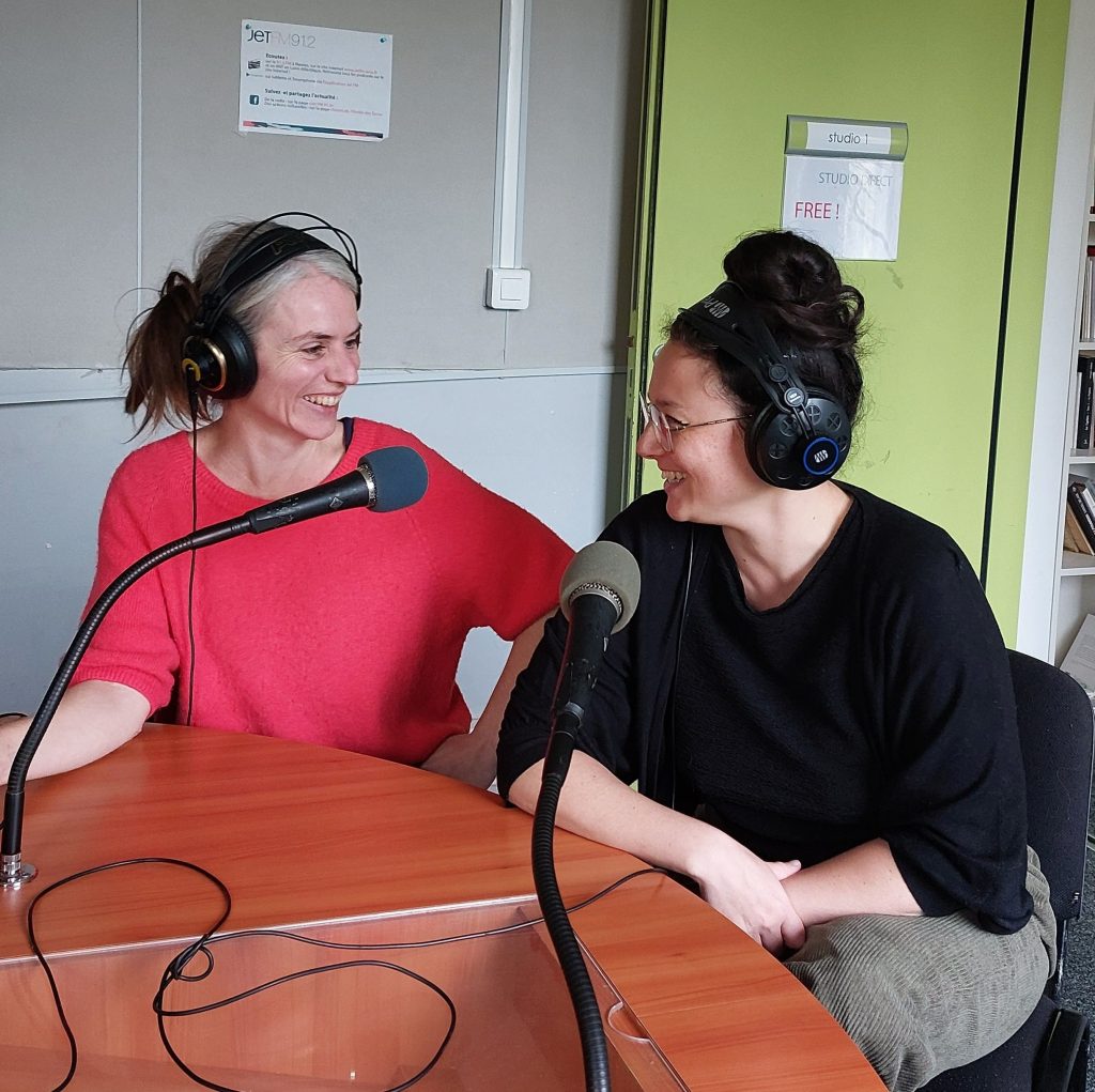Dans leur studio du quartier Bellevue, Valentine Chevalier, coordonnatrice, et XM Tram, responsable action culturelle et éducation aux médias de Jet FM ne cachent pas leur camaraderie. Crédits Valérie Babin – 30/10/2025