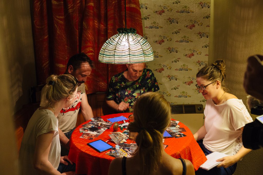 D’abord le spectateur monte sur scène pour se diriger dans une structure close où il voit des portes (huit) qui s’ouvrent et se ferment suivant huit comptes à rebours tous différents (placés au dessus de chaque porte). Dans chaque pièce des voix singulières se racontent, et dans le sas commun, quelqu’un est là, un.e hôte.sse.