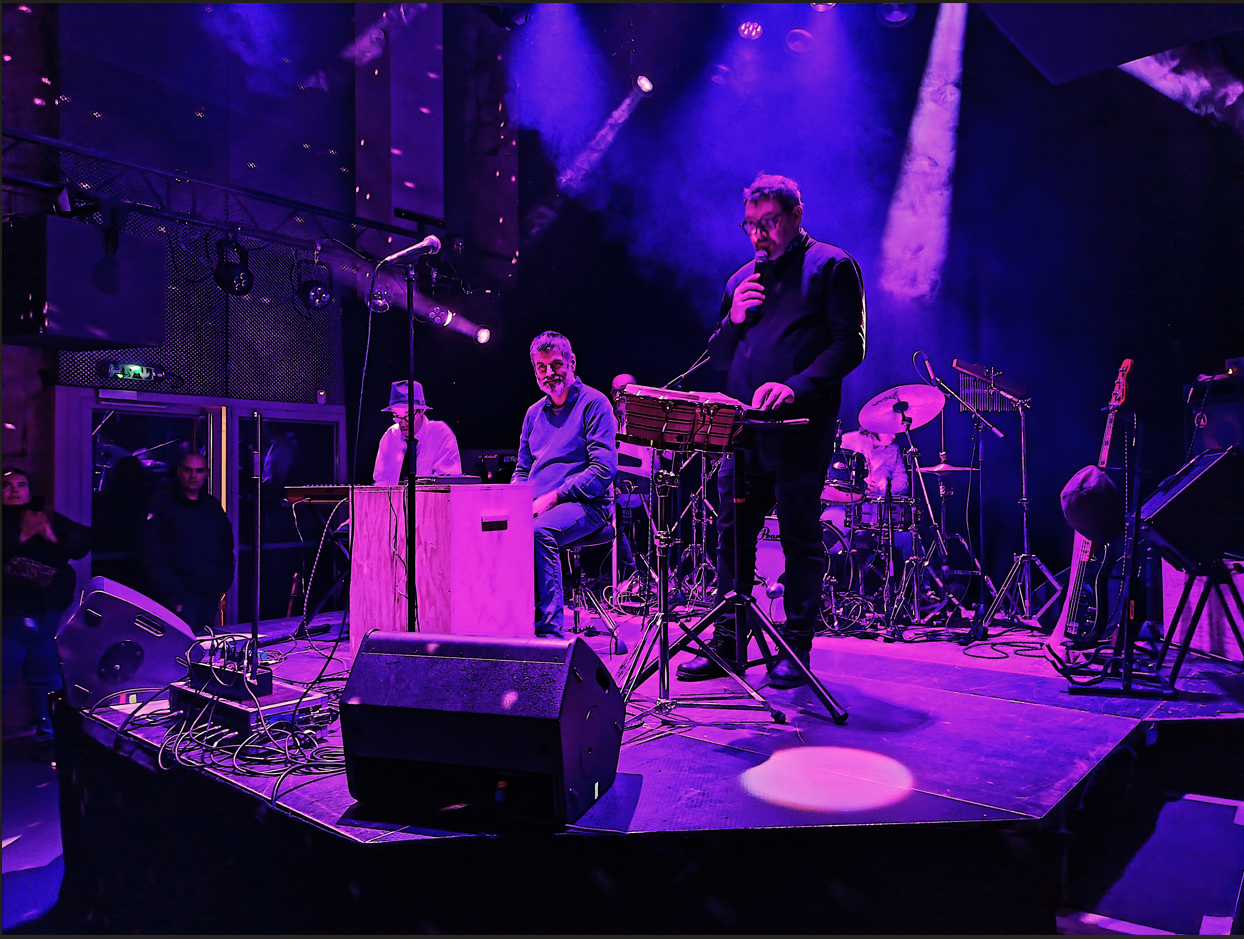 David Bertholot est en train de présenter le premier groupe formé à partir des ateliers adaptés. Un dispositif permettant de proposer un enseignement musical en studio pour des personnes en situation de handicap. Le coordinateur est lui-même à la baguette pour vérifier que les artistes sont prêt·es. Il fonctionne avec eux par « signe » précise-t-il. Et il ne cache pas sa joie après leur performance sur scène : « J’ai adoré joué avec eux ce soir. Iels n’étaient pas énervé·es, pas stressé·es, ils étaient bien dans l’écoute et la rythmique« . © Farnoud Pierre 13/01/2026