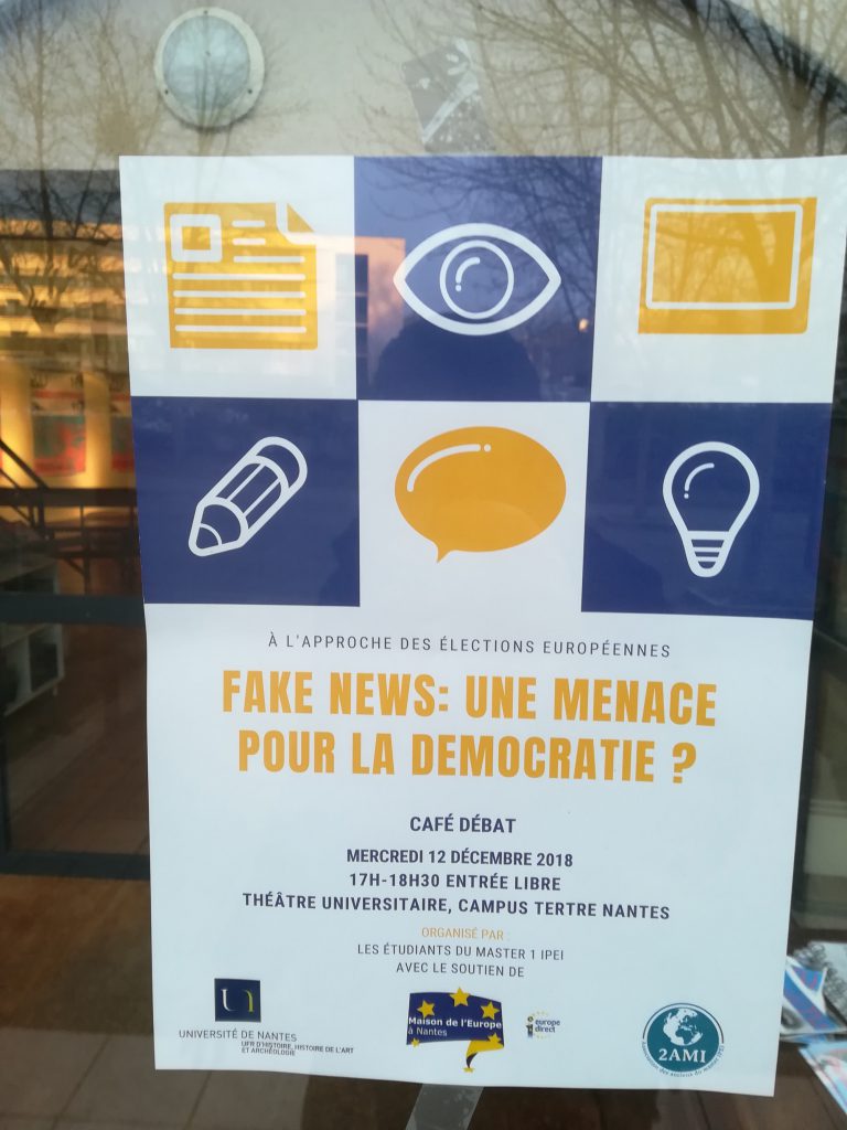 Dans le cadre d’un projet supervisé par Lucile Allanos, chargée de projets pour la Maison de l’Europe, Paola Gaffiero, Krizstina Gyorgy, Krstine Kirakosiani, trois étudiantes en Master « Ingénierie en projets européens et internationaux » à l’Université de Nantes, ont organisé un café citoyen/café débat autour des Fake News et de la désinformation, notamment dans le cadre des élections européennes qui auront lieu l’année prochaine.
