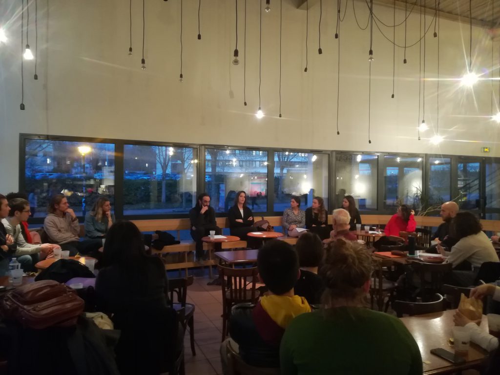 Une trentaine de personnes de tous âges et de tous horizons (avec tout de même une majorité d’étudiantes et d’étudiants) se sont réunies dans l’espace café du Théâtre Universitaire pour assister au débat animé par madame Turmo, enseignante à l’université de Nantes et responsable du Master « Ingénierie en projets européens et internationaux », et Merwann Abboud, chargé de projets médiatiques et numériques pour l’association Fragil.