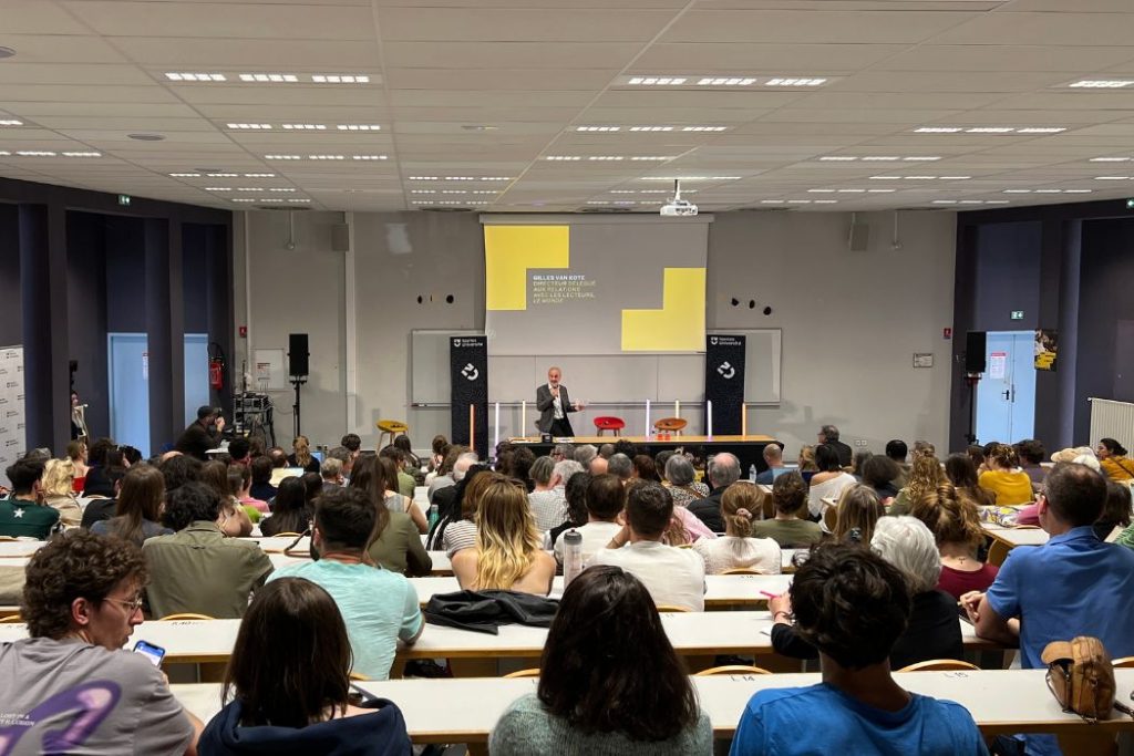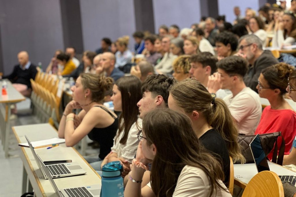 Pendant l’évènement, l’ambiance est attentive et studieuse dans les rangs de l’amphithéâtre, dans lequel plus de 300 personnes se sont installées. Le 7 avril 2026 © Amélie Fortin