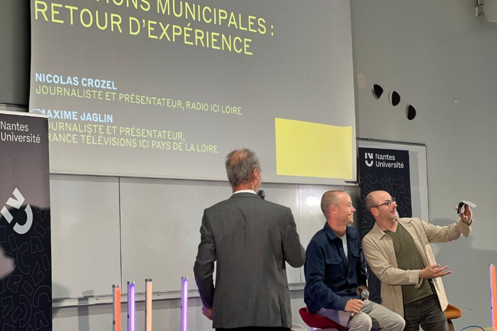 Nicolas Crozel, journaliste de la radio Ici Loire et Maxime Jaglin, journaliste de la chaîne Ici Pays de la Loire à France Télévisions, immortalisent le moment avec enthousiasme : « C’est pas tous les jours qu’on peut parler de notre métier devant autant de gens. » Ils débutent leur intervention par une statistique choc : « Pendant les municipales  2026, 1 électeur sur 4 a utilisé Chat GPT avant d’aller dans l’isoloir. » Le 7 avril 2026 © Amélie Fortin