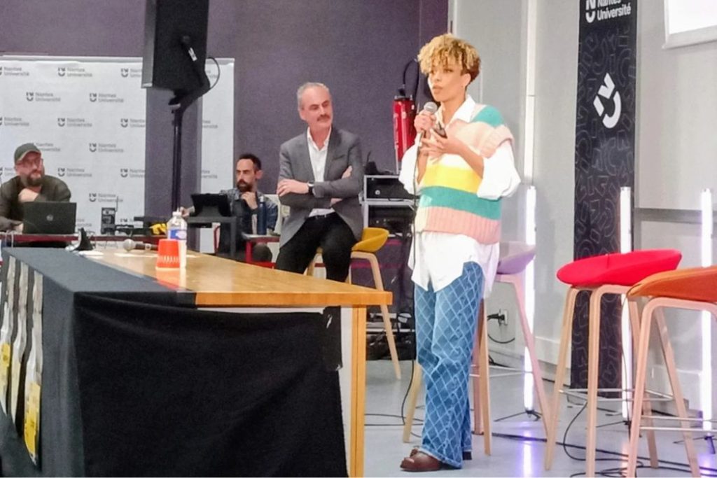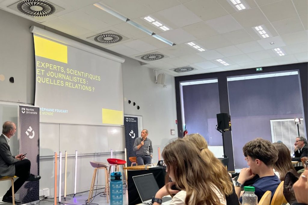 Reportage photos. Les Amphis de l’Info ont eu lieu à Nantes ce 7 avril 2026. Pendant 2h, dans un amphithéâtre du campus Tertre de l’université de Nantes, des journalistes du Monde, de France Télévisions et du réseau de radios Ici ont échangé avec le public autour de la fabrication de l’information et de la désinformation et des impacts de l’intelligence artificielle sur les médias.