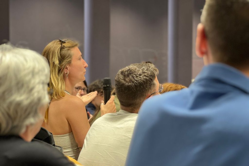 À chaque intervention, les mains se lèvent pour prendre la parole. Un micro circule dans l’audience, permettant à quelques personnes de poser leurs questions. Un temps d’échange informel prolonge l’évènement à la sortie de l’amphithéâtre, autour d’un pot entre le public et les journalistes. Le 7 avril 2026 © Amélie Fortin