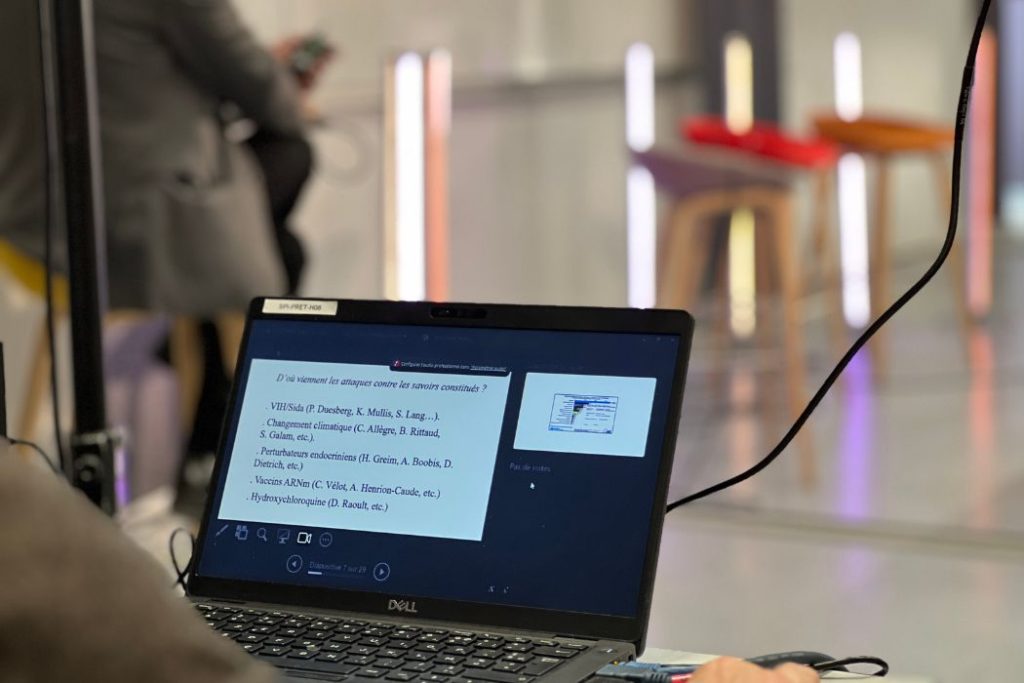 Stéphane Foucart, journaliste spécialiste des questions environnementales au Monde, pose le cadre de son intervention : « Si dans la presse locale, l’information est facilement vérifiable par les habitant·es du territoire, en journalisme scientifique, c’est complètement l’inverse […] car c’est la connaissance scientifique qui créé l’information, à partir de données inexploitables par le commun des mortels. » Pressé par le temps limité à 15 minutes par intervenant·e, il explore cet enjeu en s’appuyant sur des exemples concrets. Le 7 avril 2026 © Amélie Fortin