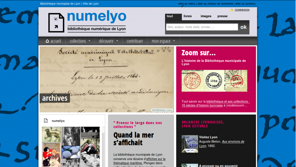 En France, on trouve des modèles hybrides. Des médiathèques classiques contenant livres, CD, DVD, etc., qui développent parallèlement des plateformes web plus ou moins poussées. Parmi les exemples notables (hors Paris), on peut citer Numélyo, la plateforme numérique de Lyon qui a pour ambition de devenir la plus grande bibliothèque numérique d’Europe. La bibliothèque municipale de Lyon fait partie de la quarantaine de structures au niveau mondial à avoir contracté avec Google pour la numérisation de fonds patrimoniaux. C’est ainsi que 400 000 documents sont aujourd’hui en ligne et accessibles très facilement : manuscrits, enluminures, périodiques régionaux, livres, etc. Un fond qui permet à Numélyo de proposer de nouveaux services comme, par exemple, des expositions uniquement visibles sur le web.