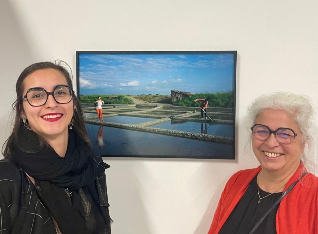 Meg Boury, artiste, performeuse et plasticienne. Maï Tran, responsable de l’artothèque. Posant devant une photographie de l’artiste lors du vernissage des Vagabondes. 12/11/25 ©JosuéTexier
