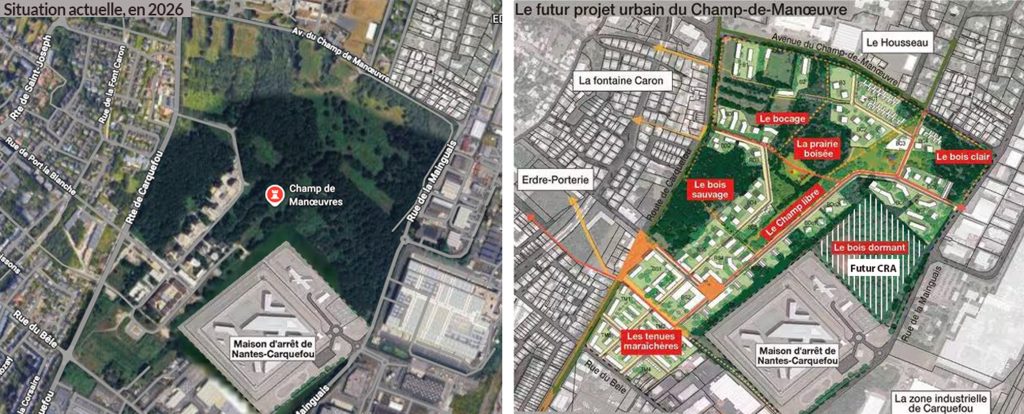 Ancien terrain de tir et de manœuvres militaires au 20e siècle, le Champ-de-Manœuvre s’étend sur près de 50 hectares à l’est de Nantes et en bordure de Carquefou. Longtemps laissé en friche, le site, classé en zones humides, abrite désormais une faune et flore sauvages remarquables. Véritable poumon vert pour l’est nantais, il était déjà menacé par un vaste programme immobilier, auquel s’ajoute désormais un projet d’État : la création d’un Centre de Rétention Administrative (CRA).