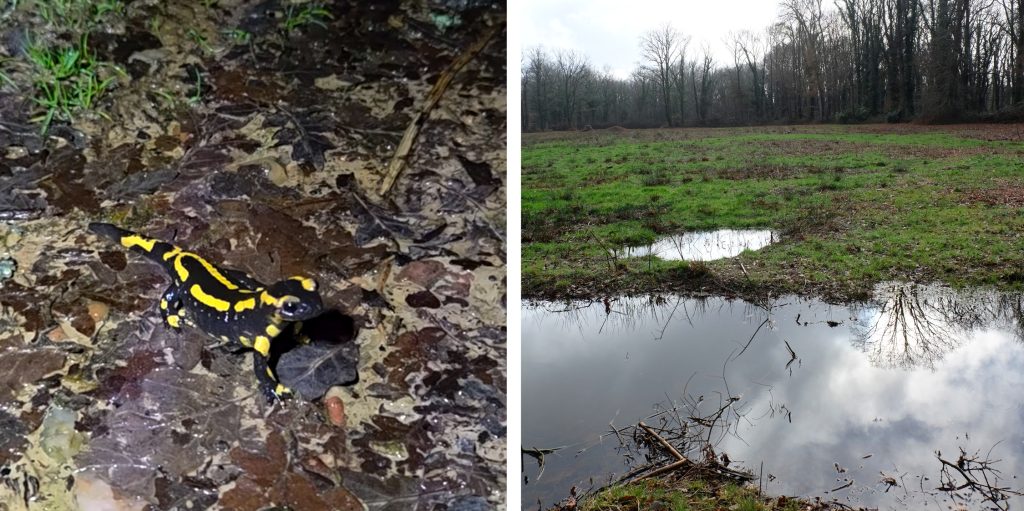 La salamandre tachetée est devenue l’un des symboles de cette lutte. Espèce protégée, elle est régulièrement retrouvée écrasée sur les nouvelles routes ou piégée dans des bassins artificiels, en raison d’aménagements inadaptés et de l’absence de passages à faune pourtant prévus initialement. Photos © ARALB et Amandine Masson, 01/02/2026