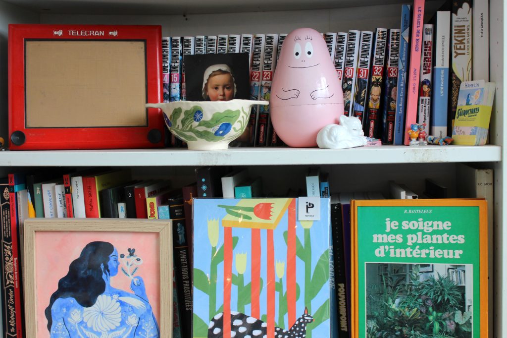 L’appartement de Marie Boiseau, situé dans le quartier Madeleine, est à l’image de son univers artistique : « joyeux, coloré » et « foisonnant ». Dans chaque recoin du salon et de son atelier, des livres et œuvres illustrés cohabitent avec une multitude de plantes vertes et d’objets déco issus des années 90 / 2000, souvenirs retrouvés d’enfance.