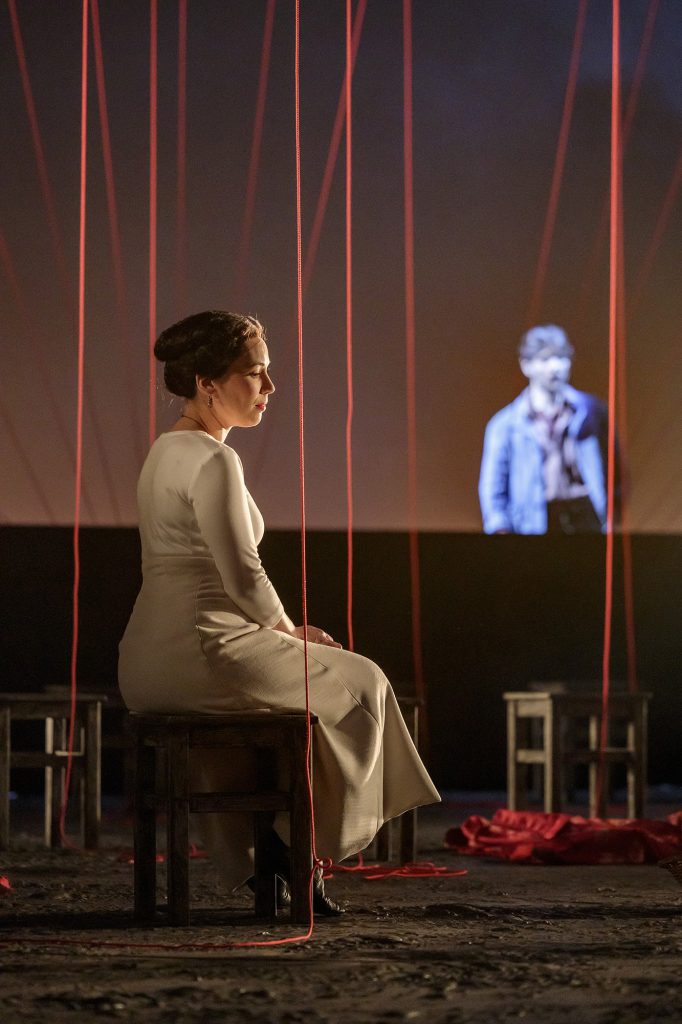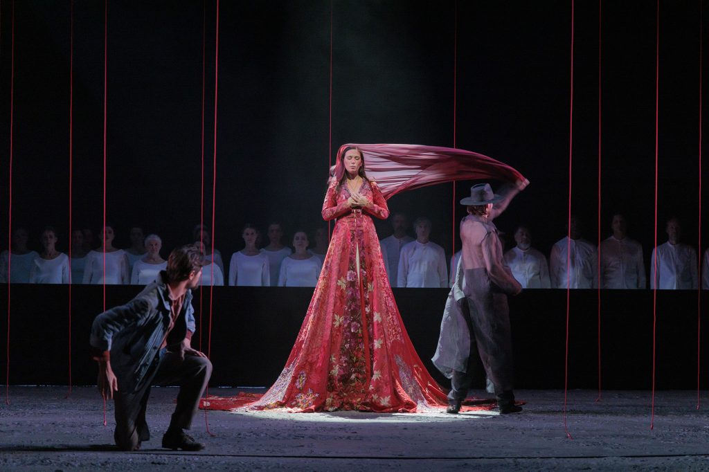 Alors que les premiers accords créent une atmosphère dramatique, l’opéra débute sur le chœur joyeux des magnanarelles, ces femmes qui étaient chargées en Provence de l’élevage du ver à soie. Le metteur en scène a transposé cette première scène dans un atelier de confection où l’on prépare une robe rouge destinée à Mireille, dans une image évoquant le chœur des fileuses du Vaisseau fantôme de Richard Wagner et introduisant une métaphore qui sera reprise durant tout le spectacle : la chronique d’une mort annoncée. Vincent aime Mireille d’un amour pur et sincère, et le premier duo explore la naissance d’un trouble auquel Gabrielle Philiponet et Julien Dran apportent leurs belles présences en scène, d’impalpables nuances dans le chant et un côté poétique accentué par de douces et chaleureuses lumières, « Vincenette a votre âge, et vous lui ressemblez ». Les amoureux font cependant le serment à la fin du premier acte de se retrouver aux Saintes-Maries-de-la-Mer s’il leur arrive un malheur. L’abandon se mêle à des silences soulignant la retenue et la pudeur, mais les élans du cœur s’affirment dans d’éclatants aigus. Les deux interprètes avaient déjà atteint de tels sommets dans Les pêcheurs de perles de Bizet à Nice en 2018. Le présage se confirme dans les mises en garde de l’inquiétante Taven, à la fois sorcière et démiurge, qui vit parmi les roches du Val d’Enfer, un site réel près des Baux-de-Provence. Vikena Kamenica donne à cette figure trouble des graves captivants de contralto intensifiant le poids de la fatalité : Mireille a trois prétendants, dont le riche Ourrias. Dans un air très lyrique, «Trahir Vincent?», la protagoniste affirme sa détermination et la puissance de son amour.