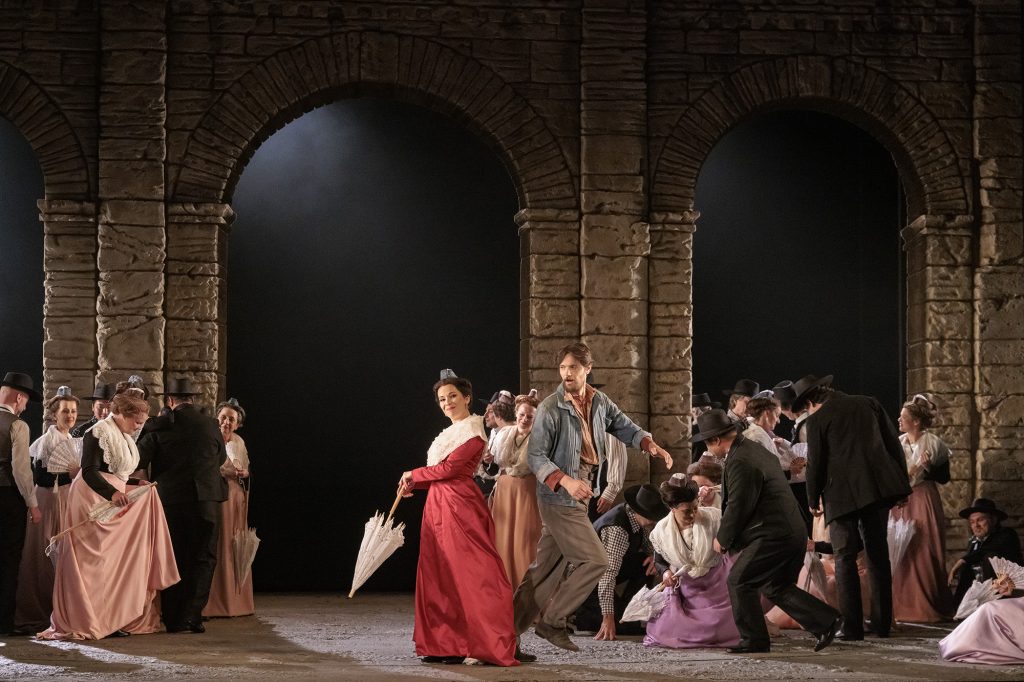 Une farandole aux Arènes d’Arles crée une atmosphère festive au début du deuxième acte, dans un mélange des registres caractéristique de l’ouvrage. Julien Dran est extrêmement touchant en Vincent, jouant l’honnêteté et la vérité, que ce soit durant la chanson populaire « Magali », ou lors de l’arrivée saisissante d’Ambroise, son père, conduit en fauteuil roulant par sa sœur Vincenette. Son chant est raffiné et riche en délicats contrastes reflétant les variations de l’âme du personnage. Ce magnifique ténor retrouvera Charles Gounod en mars 2023 en abordant le rôle de Faust à l’Opéra de Limoges, dans une mise en scène de Claude Brumachon et Benjamin Lamarche, qui ont réalisé de stupéfiantes créations à la tête du Centre Chorégraphique National de Nantes entre 1992 et 2015. Mireille, vêtue de sa robe rouge pour la fête, éprouve une nouvelle secousse en apprenant par Taven qu’ Ourrias a demandé sa main à son père, Ramon, qui cautionne le mariage. Elle rejette vivement son prétendant. La confrontation des deux pères est particulièrement rude et violente. Ambroise révèle à Ramon que son fils est épris d’une fille plus riche que lui, le second répondant avec arrogance qu’il n’a qu’à le battre, ce à quoi le premier rétorque : «Quand votre chien demande à boire, qu’on l’assomme!». Lorsqu’il réalise qu’il s’agit de sa propre fille, le père de Mireille se déchaîne contre Ambroise et, dans une image perturbante, bouscule son fauteuil roulant et le jette à terre. Complètement aveuglé, Il s’oppose avec force au mariage, lève la main sur sa fille et la maudit, mais elle lui pardonne malgré tout.