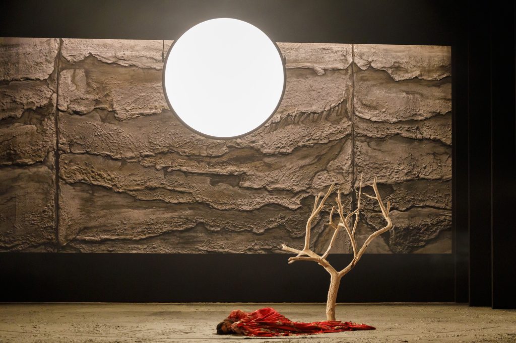 La robe que Mireille portait à Arles se consume lors de cette fête des moissons, se réduisant en cendres dans une image forte illustrant la passion brûlante mais aussi l’incertitude et la menace. La protagoniste apprend cependant par Vincenette que Vincent est vivant, tandis que le passeur traverse la scène à la fin du duo. Mireille décide alors d’honorer son serment en se rendant en pèlerinage aux Saintes-Maries-de-la Mer. Par une nuit de pleine lune, un jeune berger joué par Albane Lucas entre en scène tirant un jouet enfantin en forme de mouton. Son chant est très pur et a quelque chose d’aérien. Dans un instant irréel, la lune devient un soleil aveuglant, le sol se dérobant grâce à une scène tournante couverte d’un arbre sans feuilles. Le redoutable passage du désert de La Crau est une épreuve pour le personnage comme pour l’interprète. Mireille, vêtue de sa robe rouge, traverse un paysage sec et aride sous une chaleur accablante, dans l’une des scènes les plus impressionnantes de l’opéra à laquelle Gabrielle Philiponet donne une incroyable ferveur. La musique est torrentielle et déborde de lyrisme, à l’image d’un combat pour avancer sur cette terre hostile, sous un soleil de plomb, jusqu’à l’épuisement final. Selon l’interprète, ce rôle réunit plusieurs voix, comme celui de Traviata, « écrit pour un soprano léger au début, il évolue à la fin vers un soprano dramatique avec un orchestre fourni ». David Reiland magnifie ces puissants contrastes de la partition dans une direction musicale subtile et pénétrante. L’héroïne arrive aux Saintes-Marie-de-la-Mer complètement anéantie pour s’éteindre dans les bras de Vincent. La robe s’étire alors de façon vertigineuse jusqu’à devenir celle d’une Madone, à laquelle Mireille se confond. Dans une ultime aria, « Anges du paradis », Julien Dran exprime sa douleur sur des notes suspendues aux aigus d’une ineffable beauté. C’est selon lui un moment délicat, « car il faut rester lyrique tout en conservant l’innocence et la douceur qui caractérisent le personnage ». L’œuvre s’achève sur un chœur grandiose ( Le Choeur de l’Opéra-Théâtre de Metz est superbe et très investi, sous la direction de Nathalie Marmeuse), qui transfigure cette mort d’amour dans une forme de « délire », de « cruelle extase ». Comme dans Traviata, le père arrive trop tard pour bénir le mariage, alors que le passeur donne un coup de faux à l’arrière plan sur une ultime image.