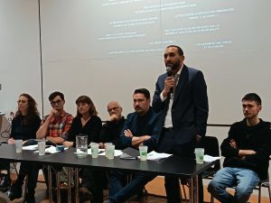 Six ont répondu à l’appel : une de Rezé, Agnès Bourgeais, tête de liste de Rezé citoyenne, une gauche unie et solidaire ; et cinq de Nantes : William Aucant, tête de liste de La Nouvelle Nantes, Mounir Belhamiti, tête de liste de Nantes mérite mieux, Alexandre Gauvin, tête de liste pour Nantes ouvrière et révolutionnaire, Christophe Jouin, sur la liste de La gauche unie pour Nantes, et Margot Mekdour, tête de liste de Nantes populaire. Les absences de la maire et surtout des candidats de droite n’ont pas manqué d’être relevées par les différent.es participant.es. Photo : Pierre Farnoud et Armel Bihan 25/02/2026