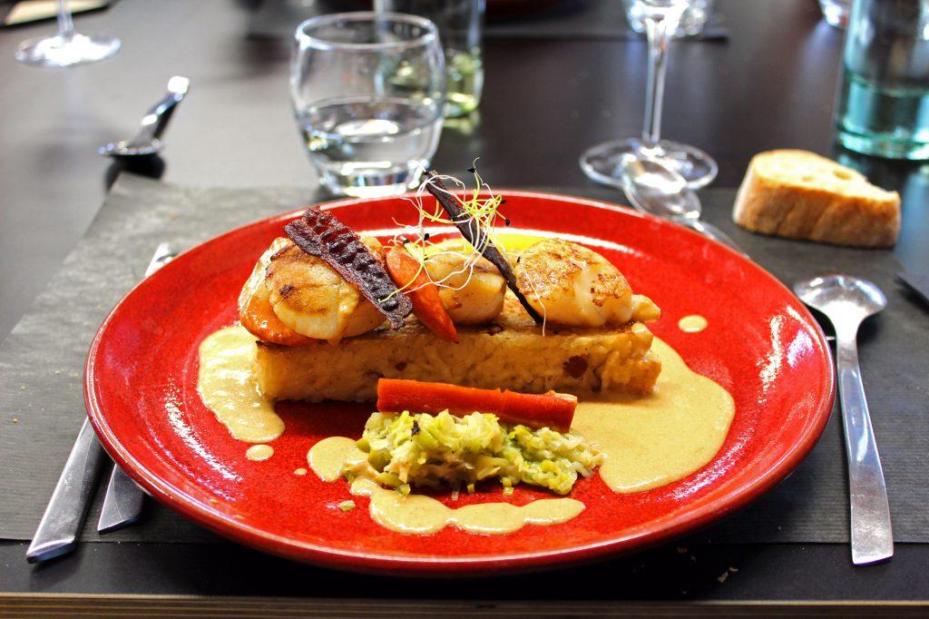 PLATS : Saint Jacques sautées, risotto snacké aux poireaux, chips et crème de lard; Volaille roulée et farcie aux herbes fraîches, grenaille sautée, compotée d’oignons, sauce soubise; Curry de légumes à la crème coco, riz pilaf.