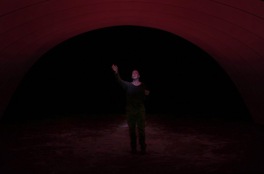La mise en scène aborde le silence et l’obscurité en plaçant Yann Boudaud, acteur, dans une caverne ou une demi-sphère ou un « punnel » comme le dit si joliment Marion Denier (régisseuse au Lieu Unique). Punnel, qui allie un pont et un tunnel. En gros, une arche basse qui crée un rapport d’échelle troublant rendant l’acteur très grand. C’est une esthétique minimale avec des jeux de perceptions dû à la faible intensité lumineuse et aux variations de couleurs. L’acteur dit le texte dans une retenue qui le rend quasi sculpteur des mots. Je n’ai jamais entendu une voix rendant le texte autant minéral.