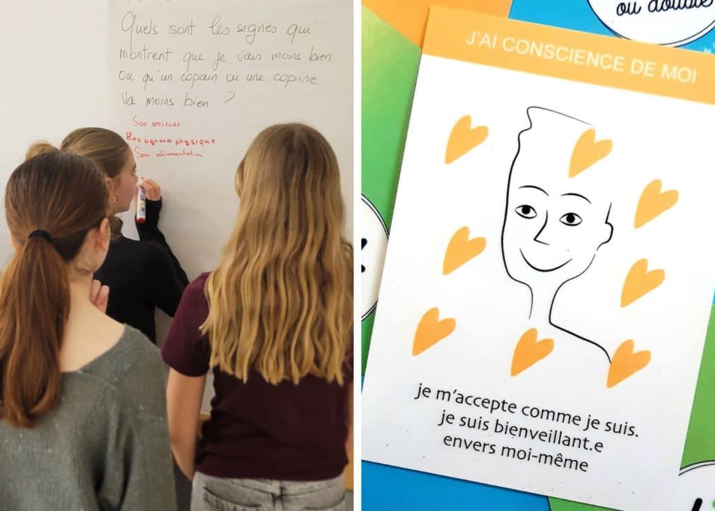 Les interventions en milieu scolaire, c’est justement le créneau de l’association Kit Ou Double, « une jeune association nantaise » créée en 2021. Elle a pour objectif principal de « sensibiliser à la santé mentale » et de lutter contre la stigmatisation des troubles psychiques. Ses actions se concentrent pour l’instant sur les collégien·nes et lycéen·nes du département de Loire Atlantique, car « beaucoup de troubles apparaissent entre 15 et 25 ans », explique Brigitte Anceaux, membre de l’équipe d’animation. L’association forme des intervenant·es qualifié·es, issu·es soit « du monde de l’éducation » comme elle, soit « du domaine de la santé », afin de garantir des interventions adaptées auprès des jeunes. L’association inclut aussi des jeunes qui interviennent comme témoins : « on intègre aussi dans l’animation des jeunes en phase de rétablissement ».