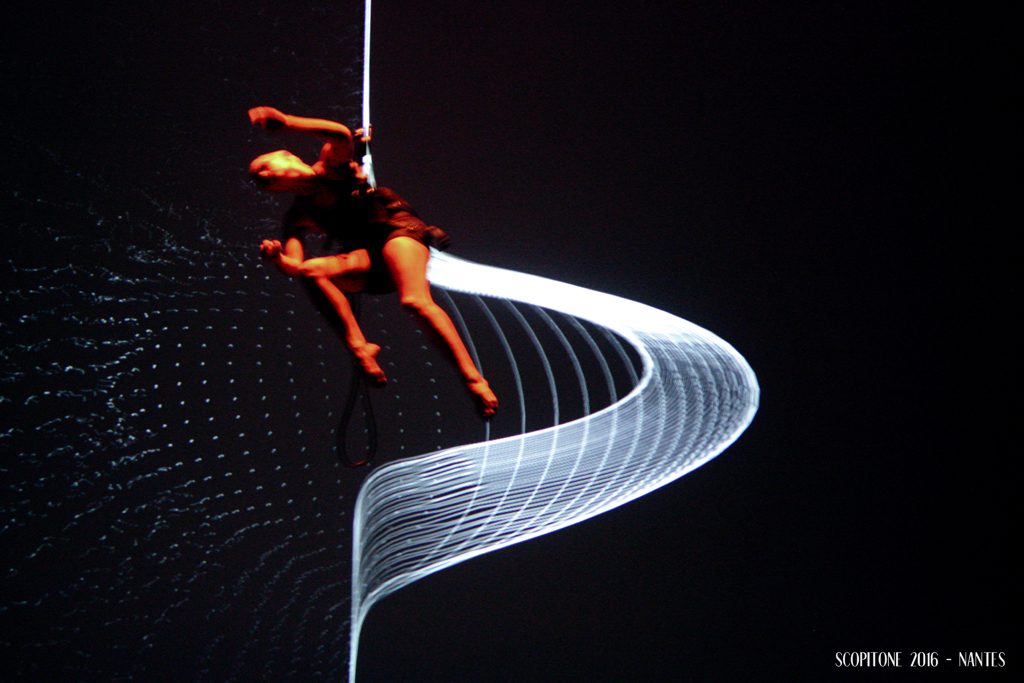 La salle maxi de Stereolux est au complet pour la soirée d’ouverture du 21 septembre 2016. La performance Ljós, qui signifie lumière en islandais, débute dans le noir total. L’écran géant s’anime et nous fait voyager à travers une voie lactée en trois dimensions. Petit à petit, la silhouette d’une danseuse se découpe sur ce fond étoilé. Le concept est original : Elena Annovi est suspendue par un harnais et elle danse en apesanteur et en synchronisation avec la vidéo sur une musique electro percutante. L’aura graphique qui l’entoure peut s’apparenter à des ailes d’oiseaux, à une toile d’araignée voire à un fœtus protecteur. La brutalité de l’electro tranche avec la douceur et la légèreté du vol.