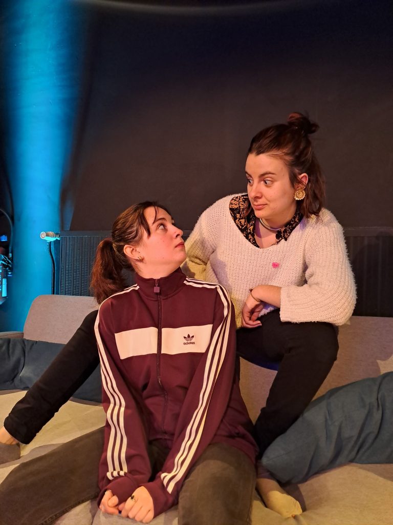 (au milieu – Lucile Bariou) raconte l’histoire de Noé (droite – Marie Haméon) et Jeanne (gauche – Bertille Legoux). Crédits : Valérie Babin – 18/12/2025