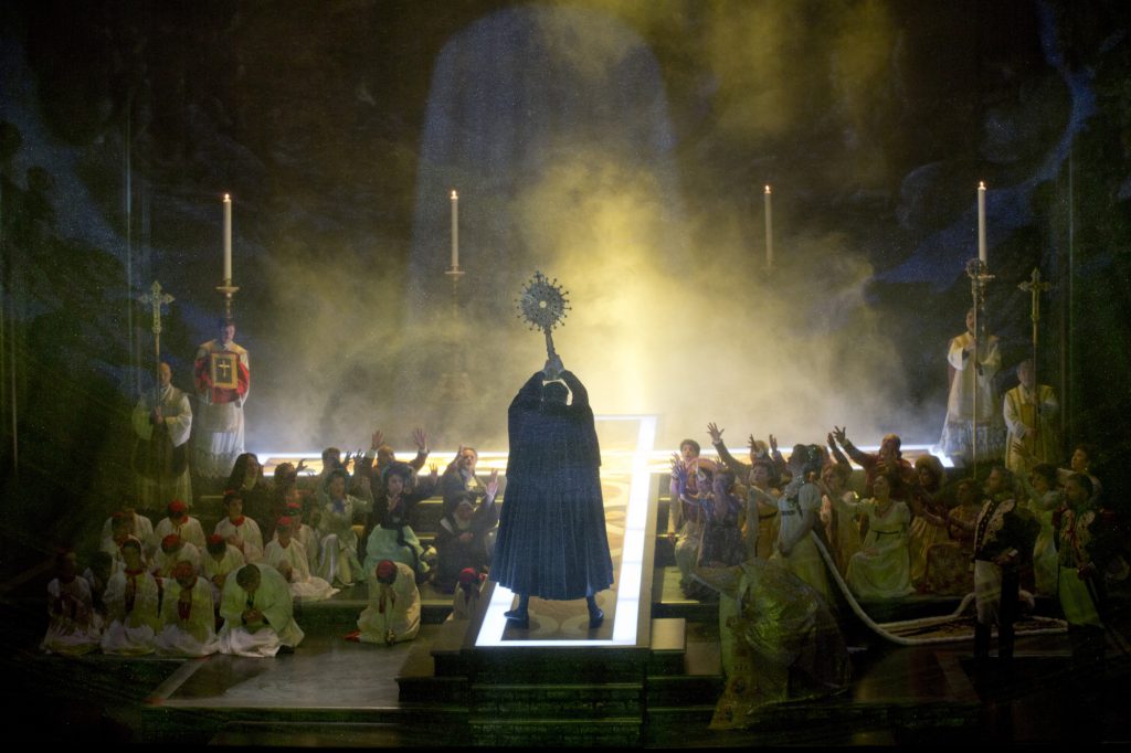 Le baron Scarpia détourne le Te Deum à la fin de l’acte, pour en faire un credo sacrilège, où il affirme son désir de posséder la cantatrice. La confusion est extrême. L’espace religieux abrite le politique, le pouvoir masque les appétits sexuels du tyran. Les enjeux et les rôles se mélangent dans les débordements du chant, que reflètent les flammes qui embrasent le plafond peint de l’église, au premier plan. Valdis Jansons sculpte cette figure de despote par une présence vénéneuse et inquiétante, et une voix profonde aux vertigineuses nuances, dont les éclats troublent et figent.
