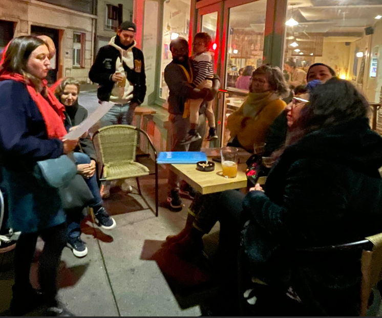 Habitante qui partage un de ses textes. En terrasse, devant le bar Yabba, le 28 octobre 2025 © Zineb Benkhider