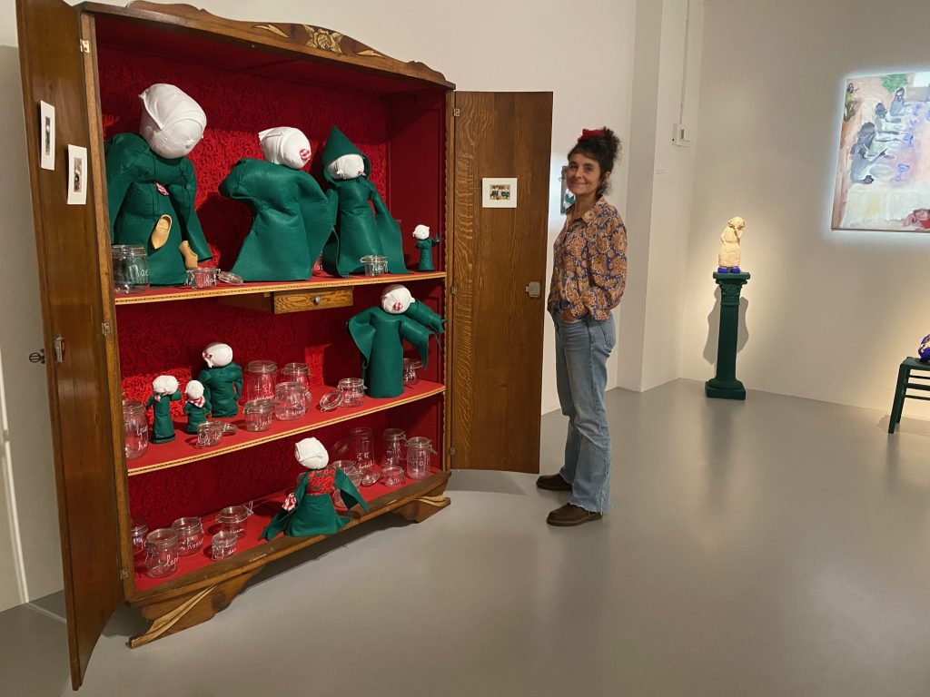 L’une des figures centrales de l’exposition n’est autre que Bécassine, cette petite Bretonne montée à Paris « qui a l’air bête mais qui l’est beaucoup moins qu’elle n’en a l’air » sourit Marie Auger. « Elle a baigné toute mon enfance puisque j’ai appris à colorier dans des albums de Bécassine. » Au travers des œuvres, on constate une évolution de traitement. La première génération de Bécassines, reconnaissables à leur robe verte et à leur coiffe pointue, ressent de « l’accablement ». Puis la seconde se dit « ça va bien, c’est quoi cette histoire ? Il y a une colère de cette transmission non actée, d’avoir perdu quelque chose du fait d’une volonté géopolitique. » L’artiste a même doté cette nouvelle Bécassine de la bouche dont elle était à l’origine dépourvue pour revendiquer l’usage de la langue maternelle.